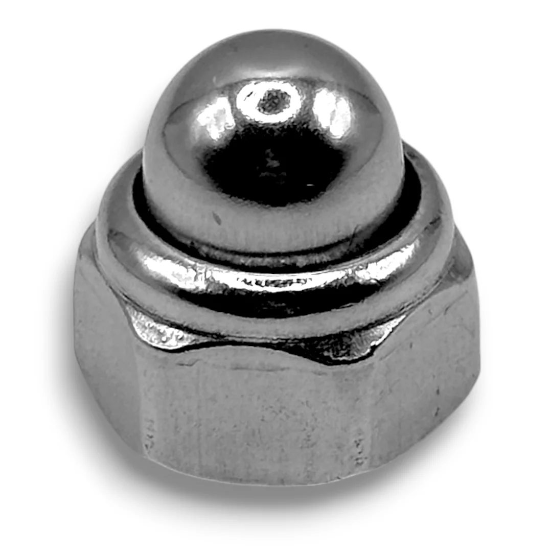 * Podwójna funkcja: Wewnątrz kołpaka znajduje się wkładka poliamidowa (jak w DIN 985), która zapobiega luzowaniu się nakrętki pod wpływem drgań. Eliminuje to konieczność stosowania dodatkowych podkładek sprężystych, które mogłyby porysować powierzchnię.