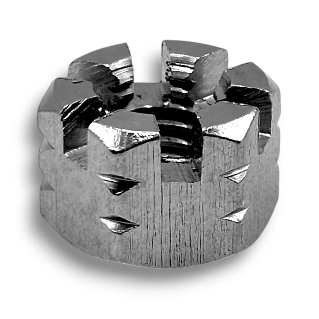 8,0mm (M8) A4 Nakrętka koronowa (do zawleczek) DIN 935. Posiada nacięcia do blokowania zawleczką. Gwint M8. Wykonana ze stali kwasoodpornej A4 (AISI 316). Najwyższa pewność połączenia w warunkach morskich i drgań.