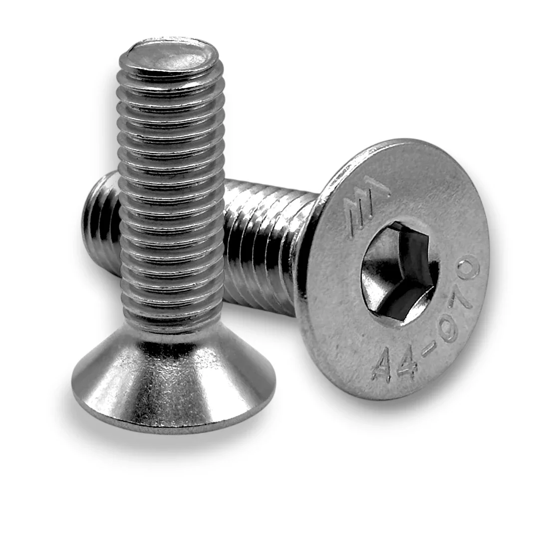Śruby z łbem stożkowym wpuszczanym i gniazdem sześciokątnym (imbus) wg normy DIN 7991 (ISO 10642) to elementy złączne łączące wysoką estetykę z funkcjonalnością. Wykonane z wysokogatunkowej stali nierdzewnej A2 lub kwasoodpornej A4, gwarantują trwałość i nienaganny wygląd połączenia przez wiele lat.